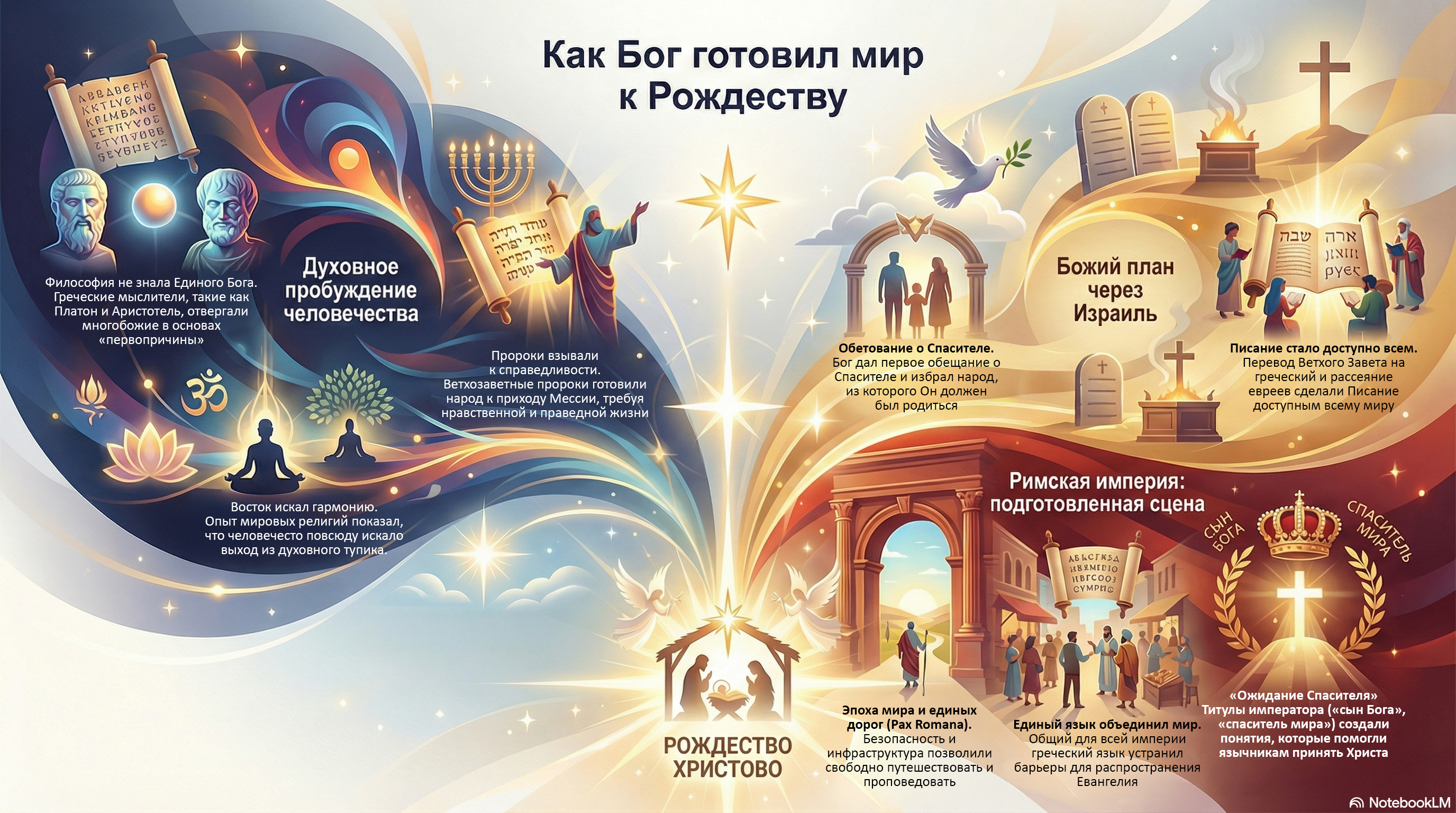 В лекции подробно рассматривается история избранного израильского народа, который через испытания, плен и заветы с патриархами, такими как Авраам, сохранял веру для будущего воплощения Спасителя. Особое внимание уделяется историческому контексту Римской империи, чьи дороги, единый язык и политическое устройство послужили инструментами для быстрого распространения христианства.